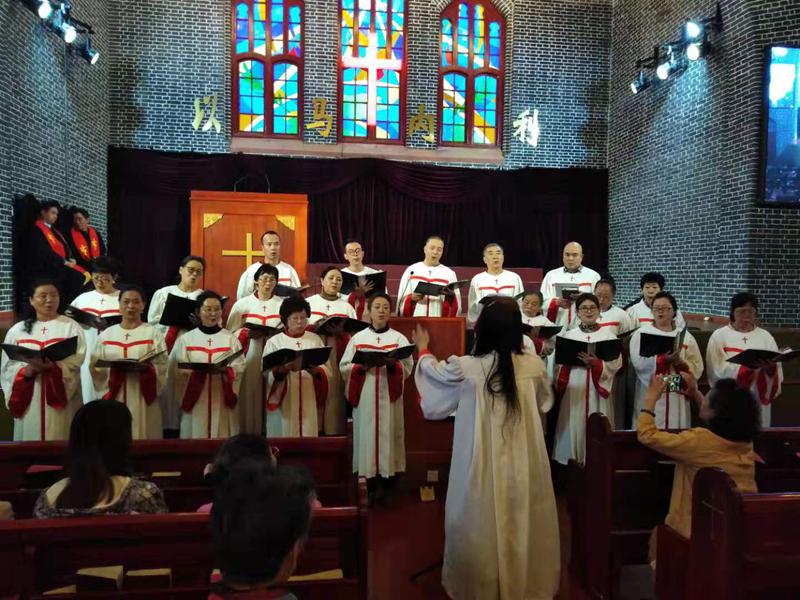 上午9:30,成都市恩光堂的主日崇拜聚会,在会众祷告及张贤升牧师代祷、主领下开始。首先是诗班在台前的献唱颂诗,只见诗班21位姊妹弟兄身着白色圣衣,依次在主台前站成三排。在陆明远牧师弹奏的优美钢琴音乐伴奏下,满怀对主的敬爱,依次有序的献唱了《数算主恩歌》、《诗篇二十三篇》、《一路引导歌》三首赞美诗歌。