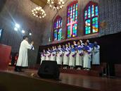 证道结束后,主领张贤升牧师宣布了两件事情。一是邀请第一次来教会的弟兄姊妹,聚会结束后到教堂两旁出口,有教会同道专门接待登记,为的是建立信息,以利于今后初信者参加培训。二是邀请四川神学院学生诗班登台献唱赞美。果然,从主台两旁有年轻的神学生登上主台,在优美钢琴音乐伴奏下,声情并茂的演唱了《求主宣召我》、《神学生之歌》诗歌,受到了现场会众热烈掌声称赞!还有不少会众,离开座位挤到台前的两侧拍照、录像。