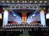 上午9:00,曙光教会第13届感恩节聚会活动,在会众祈祷和主持人陈健代祷后拉开了序幕。首先是他们约书亚、迦南两个诗班登台共同献唱赞美。只见85名弟兄姊妹,身着白色圣服,天使般在主台前依次依阶站成五排;在李娜姊妹激情指挥下,在白雪、曹萍俩姊妹分别在两架钢琴上、弹奏的优美钢琴音乐伴奏下;他们满怀对主的感恩之情、献唱了《崇高的上主》、《奇异恩典》、《哈利路亚》三首赞美诗歌。他们的精彩献唱,赢得了会众阵阵赞赏掌声!