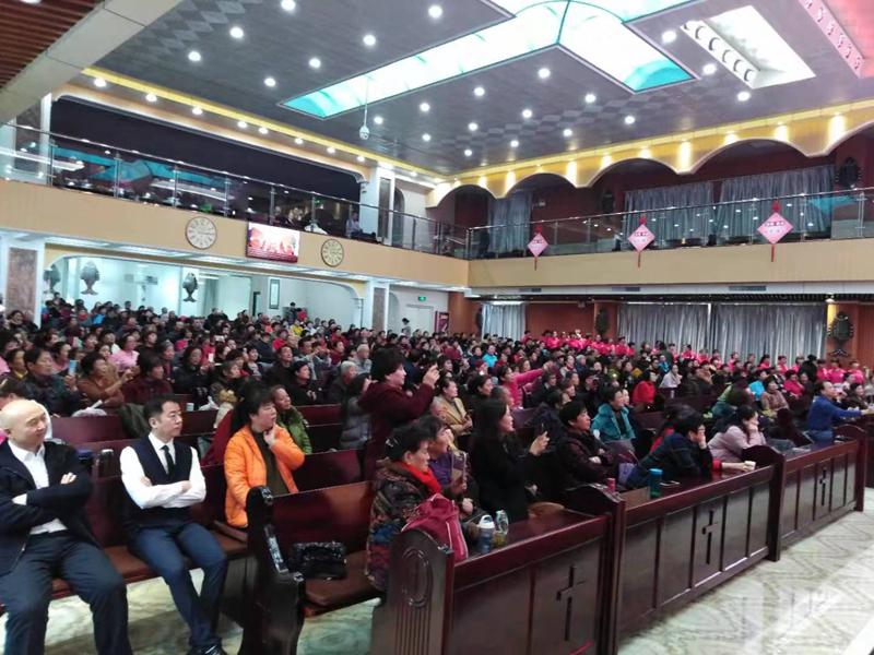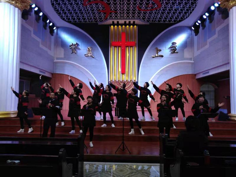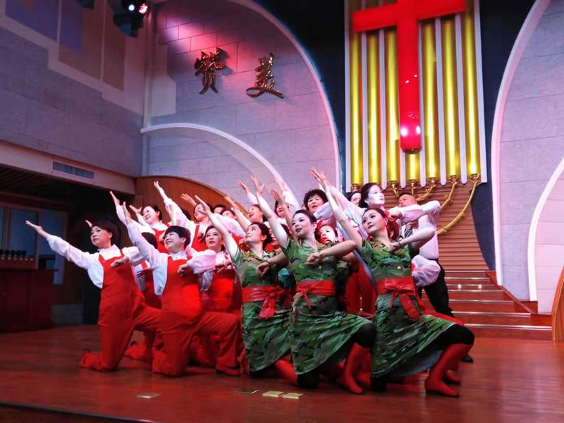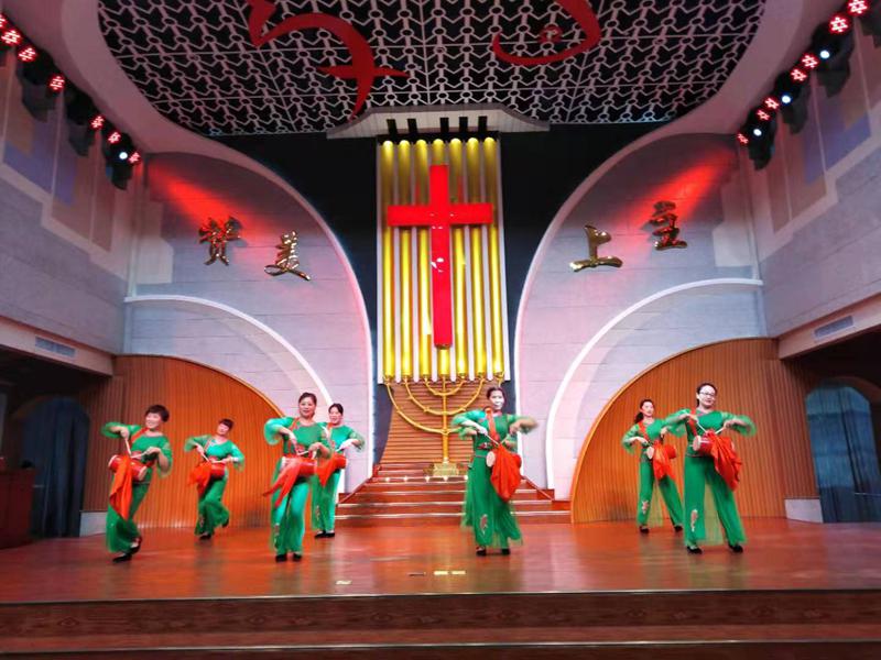 最后的压轴节目,是教会诗班带来的大型舞蹈《祝福中华》。只见一群诗班姊妹身着中华各色民族节日服装,手擎百合花;在优美背景音乐继续陪衬下。她们如同天使般美丽,翩翩起舞、如蝶旋飞。歌唱亲爱的祖国,赞美大我中华!神的儿女,爱国爱教情怀在这里得以淋漓体现,神的儿女,中华民族自豪感在这里得以升华!变化的彩色灯光点缀整个主堂,美轮美奂的舞蹈大放异彩。在节目结束亮相时,黄底红字的“祝福中华”巨幅牌被四位弟兄高高举起。刹那间,台上台下感情得到了共鸣。会众齐刷刷站了起来,拍起了热烈的掌声,以表示对精彩节目的赞赏,更是表达了神的儿女对伟大祖国的无限热爱!