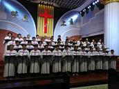 紧接下来,首先是曙光堂老年诗班登台献唱。你看这些老人,他们淡妆粉眉,相互照应着、在台前站成四排,如同一幅夕阳染红的晚霞美景展现在大家的眼前。钢琴乐曲渐起,他们满怀对主感恩的情感,献唱了《耶稣,有你真好》、《敬虔的奥密》两首赞美诗歌。别看这些老人年龄大了,他们的献唱,不亚于青年诗班上午的表现。这真是:人虽年老志不老,年龄虽大志更大;两鬓斑白菊花笑,感恩献唱展年华!在大家眼里,这些老人们是那么可爱、可亲。虽然个个年已花甲,但看去还是那么精神饱满、喜乐健美,唱起歌来气如长虹、歌声宏亮。老年诗班不同凡响的献唱赞美,同样赢得了会众热烈掌声的赞赏!