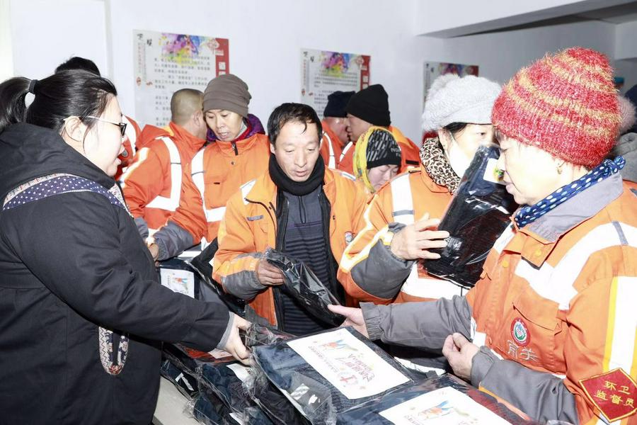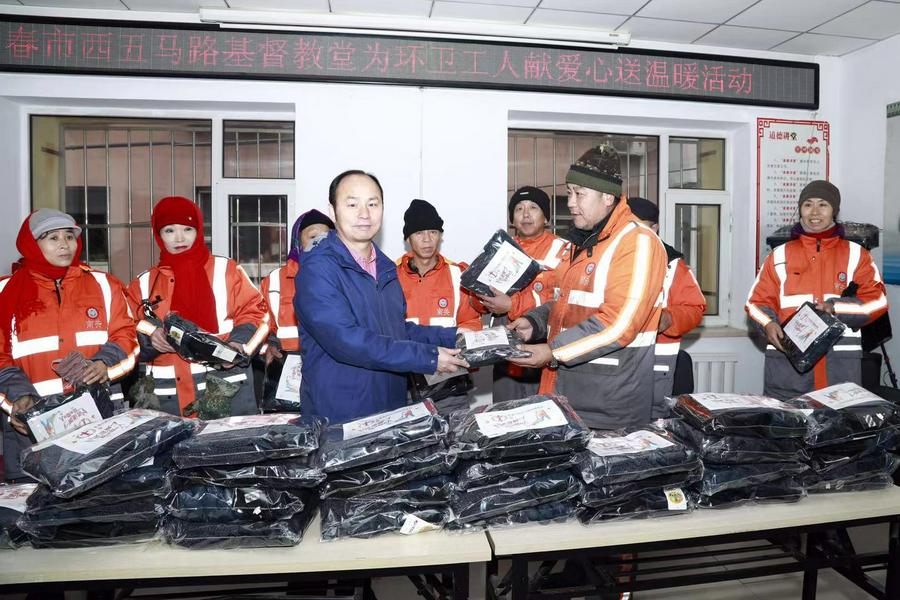 2019年12月15日上午,长春市西五马路基督教堂的教牧同工来到长春市南关区新春街道通顺社区,举行为环卫工人送温暖活动。
