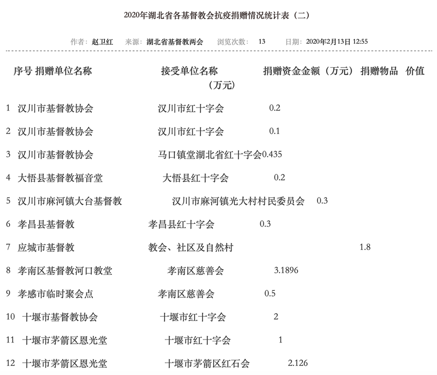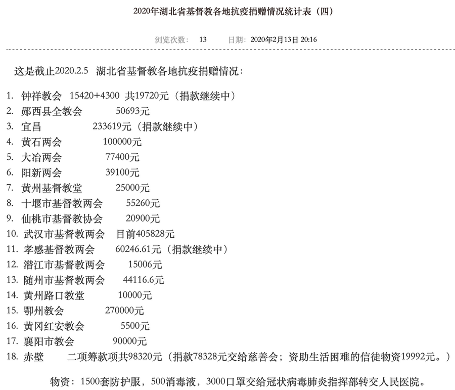 2月13日,湖北省基督教两会通过官网公布了各地抗疫的捐款信息,表示在省民宗委的统一部署下,组织省内各基层教会与信徒捐款捐物,支援抗疫一线。