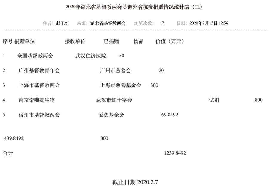 截至2月7日,全省基督教各教会通过该省慈善总会等多种渠道,捐赠资金67万余元,省基督教两会联系省外爱心企业和人士捐赠资金近440万元,捐赠测试剂等物资800余万元。湖北省基督教协会与中南神学院收到爱心人士捐款47万,25350个口罩,已陆续转交相关防控抗疫单位。后续的物资和款项捐赠工作还在持续进行中。