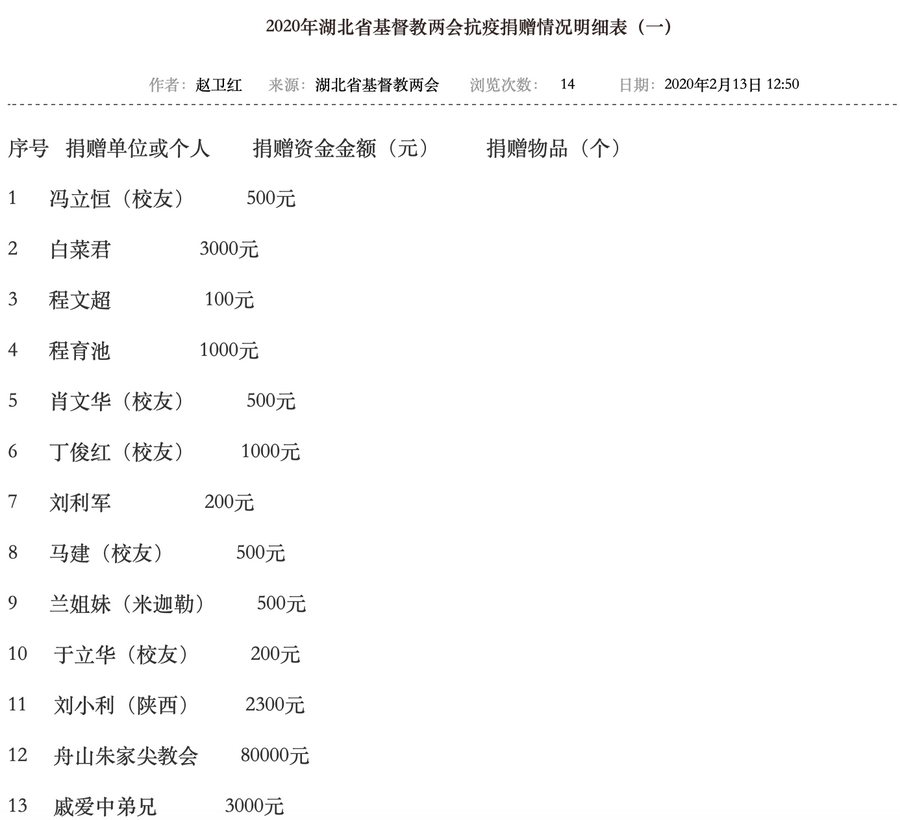 2月13日,省基督教两会一共发布了四个抗疫捐赠情况明细表,包括省基督教两会捐赠、省内各教会捐赠和协调外省抗疫捐赠。