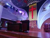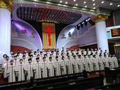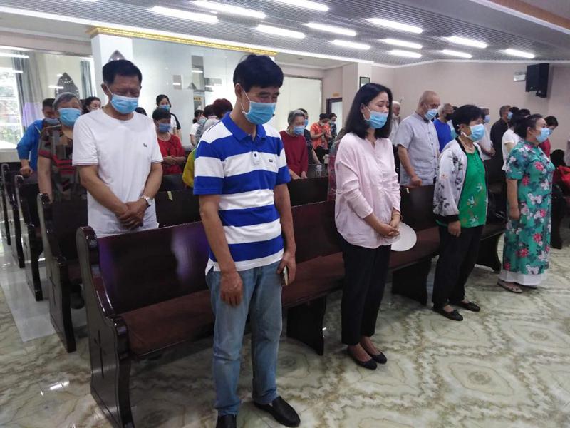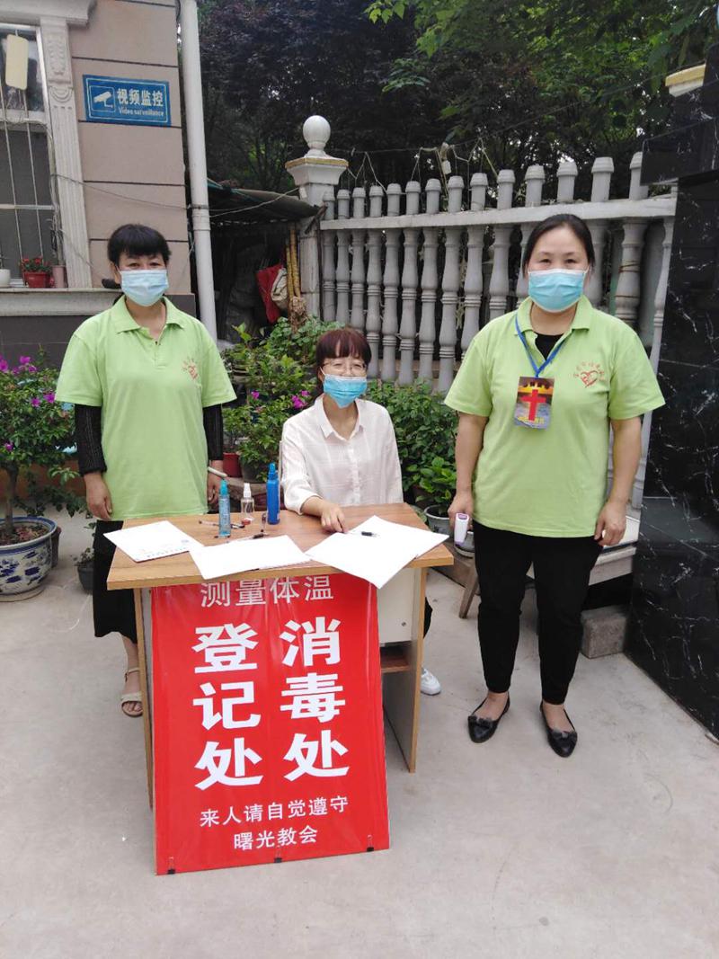 在早晨8:30,笔者来到了宝鸡曙光教会,看到已有不少弟兄姊妹自觉戴着口罩,在东西两个大门口,依旧井然有序间隔1米排队、依次用手机扫描“健康二微码”、接受“安全员”姊妹们的测量体温检查,然后登记有关各自信息后才能进入教堂。笔者随大家“过关”后,一溜来到二楼主堂,里面早已是灯壁辉煌。主台前陈姊妹正在教唱《慈父上帝歌》,笔者找了一个被“小黄色”标志隔好的空座坐下。聆听着优美音乐,和大家一块跟着学唱《慈父上帝歌》。