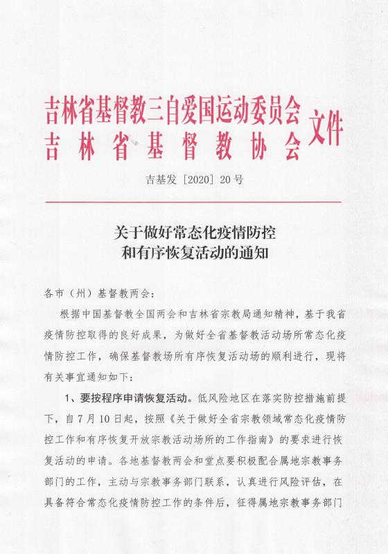 2020年7月10日,吉林省基督教两会下发通知,要求各市州基督教两会和省内基督教活动场所,按通知要求积极做好常态化疫情防控,并为恢复活动做好准备工作。