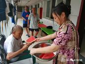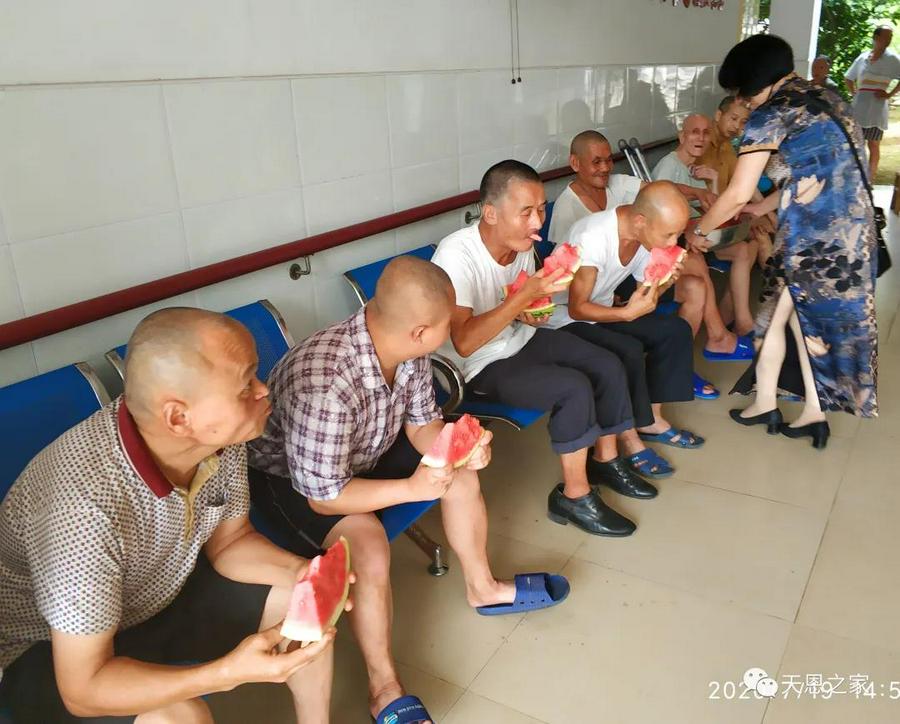 弟兄姊妹们买来西瓜,用小汽车运到福利院,将切好的西瓜送到每位老人的手上,他们吃着西瓜,甜在口里、爽在心中、笑在脸上,对因身体行动不便不能走出房间来到大厅的老人,做到不漏一人将西瓜送到房间和床前。弟兄姊妹们还带上理发工具,为每一位需要理发的老人理发,容光焕发的他们笑逐颜开,连声感谢基督教信徒们的到来。