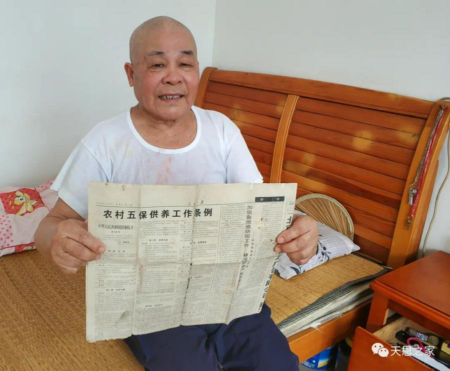 七十九岁的易建忠老人边吃边说,要感谢党和政府给了他们幸福的晚年。在房间里他拿出珍藏十几年的人民日报,高兴地向我们展示刊登在人民日报上的2006年国务院颁布的《农村五保供养工作条例》,说这就是他们幸福晚年的保证。