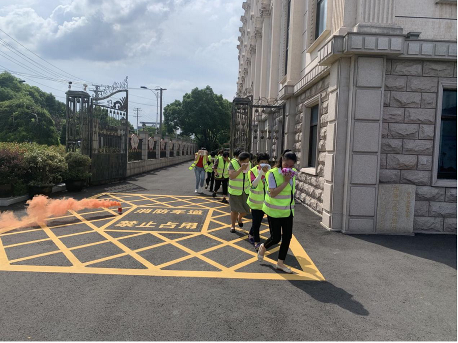 伴随火灾警报响起,消防演练正式开始。场内烟雾四起,演练人员用湿毛巾捂住口鼻,迅速而有序地撤离“火灾”现场。到达安全地带后,各组长进行人数清点,发现缺少1人,立即通知官林消防中队。官林消防中队闻讯后及时赶赴现场,抢救落单的“被困伤员”。