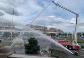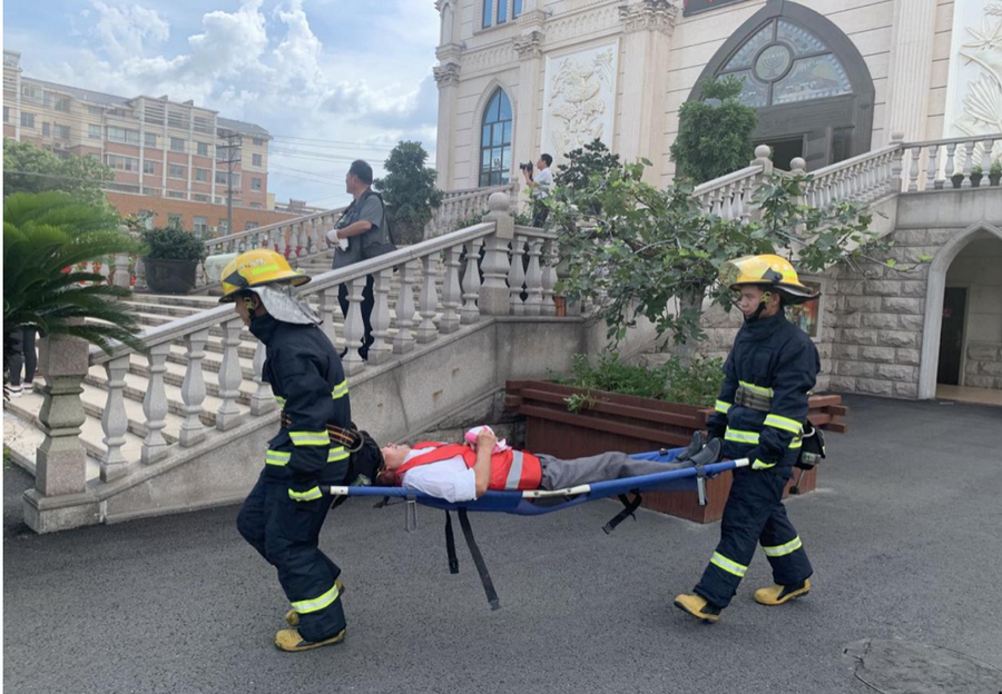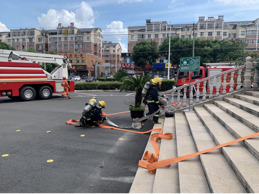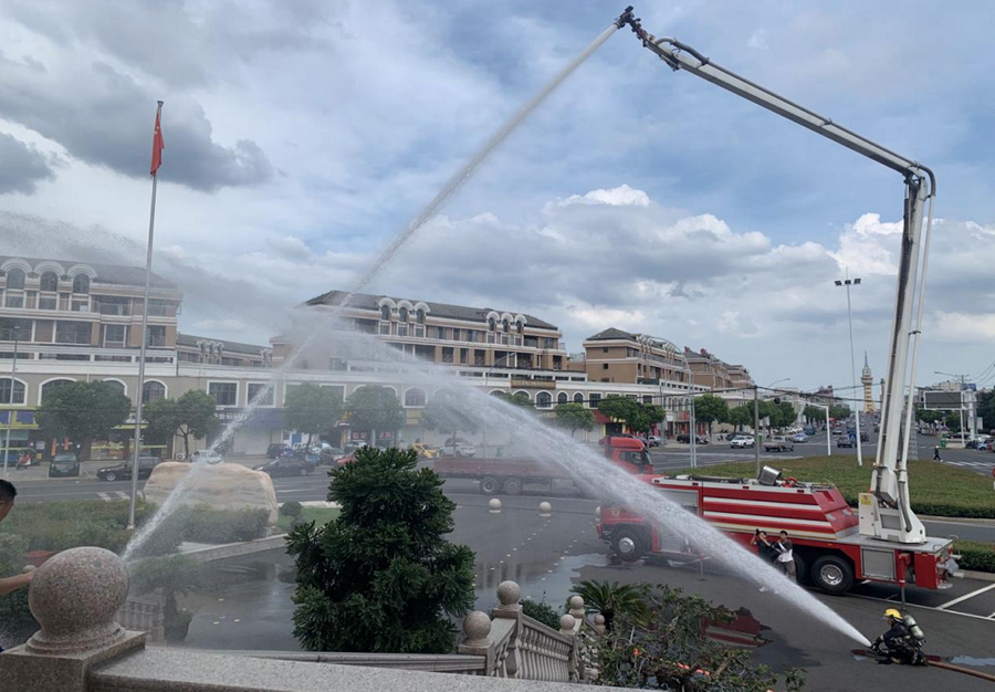 在演习人员全部撤离至安全地点后,消防队员搭连水管,使用高喷消防车、高压水枪进行紧急喷水灭火,最终大大火被顺利扑灭。