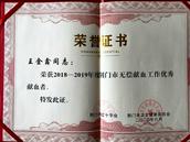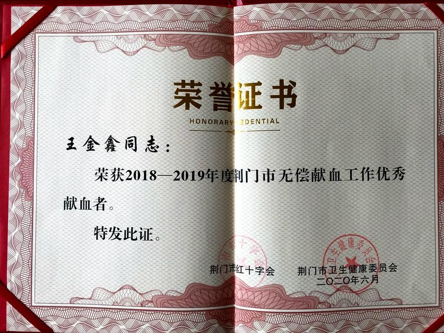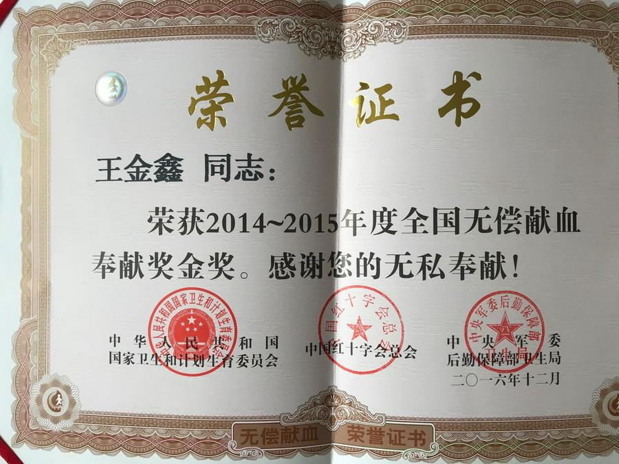 谈到十七年的献血,金鑫牧师很谦卑和低调。笔者知道献血是有国家有关部门颁发的证书的,跟他要多年献血的证书照片,可是费了“九牛二虎”之力,当我说明了这是为主作见证,王牧师才出示了部分的献血证书。看看那红色的证书,不正是主十字架宝血在当代的荣耀嘛!