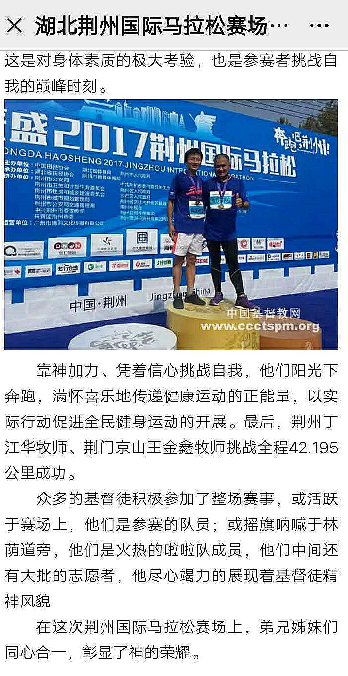 让我们回顾2017年11月1日全国两会《中国基督教网》的报道吧,题目:湖北荆州国际马拉松赛场上的基督精兵。