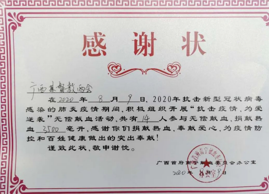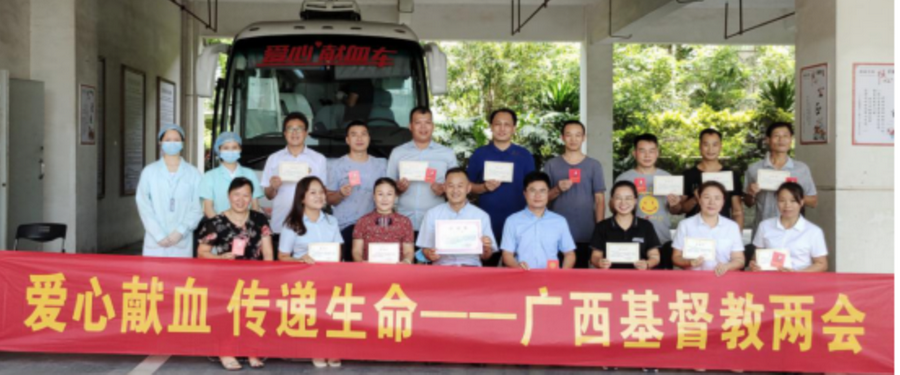 因受新冠肺炎疫情影响,广西南宁市血库库存告急,广西基督教两会在2020年8月9日举行了“爱心献血,传递生命”的无偿献血活动,为缓解血荒,为社会公益事业献上一份力量。