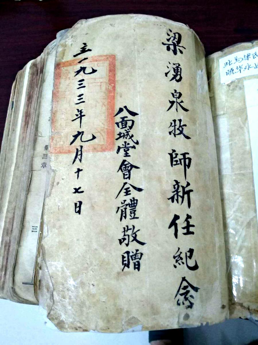仅此而已。但是感谢主!此次八面城之行也不徒劳往返,还是有些收获的:一是,查阅到八面城的基督教教会历史从1878年即开始,距今已有一百四十二年!而那些被人熟知的东北著名的教堂,如基督教沈阳东关教堂,也就是始创于1876年,这里的教会历史仅仅比沈阳晚了二年;二是,现在的八面城教会只知道当年有一位牧师,但是姓名、籍贯等不详。通过山西临汾的张晓华长老提供的信息,我告诉教会:上个世纪三十年代,张晓华长老的姥爷梁涌泉弟兄(原名梁文海),山西洪洞人,曾在八面城传道,于1933年9月17日被按立为牧师(见图)。这样,八面城教会就弥补了教会历史的一段空白。