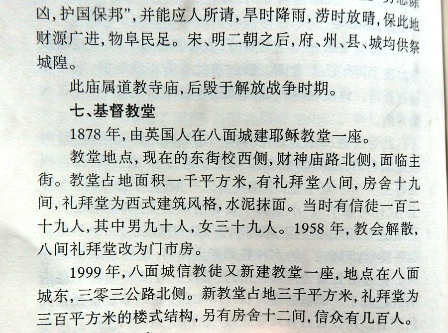 1999年,八面城信徒又新建教堂一座,地点在八面城东,二零三国道北侧,新教堂占地三千平方米,礼拜堂为三百平方米的楼式结构,另有房舍十二间,信徒有几百人。”(见图)这也是难得的历史资料!