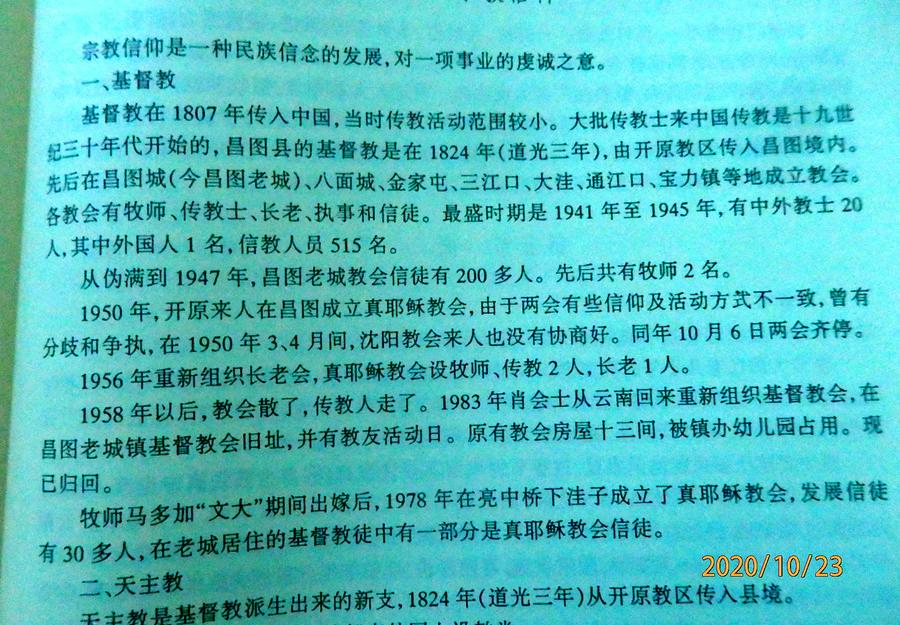 这里要简单说一下《昌图府志》中提到的“耶稣堂”。什么是耶稣堂?根据我个人的信仰经历了解,基督教新教于十九世纪初传入中国,被习称为“基督教”或“耶稣教”。这“耶稣堂”其实就是基督教堂,或者说是耶稣教会。只不过在不同时代有不同的叫法。因为我母亲就是在上世纪二、三十年代信主的,她当时所处的那个年代我们基督教新教在中国就叫做“耶稣教”。我从一小母亲就经常告诉我:我信耶稣,我是耶稣教。所以我打一小就知道耶稣、耶稣教。我通过一些八九十岁的老信徒聊天中也得知,当时新教确实就是被称为耶稣教。而且我母亲那个年代信主的人,祷告的时候总是爱说“主啊!”、“耶稣啊!”或“上帝啊!”,他们不说“神”,他们那代人看的圣经版本,对上主耶和华父神都是称之为上帝,而不是神。我想,这也是我们的和合本圣经为什么有“神版”和“上帝版”的原因吧。因为上帝就是指“ 神”,神也是指“上帝”。在《昌图府志》中,就已经把天主教和耶稣教分开记载,足以说明当时基督教的这两个宗派已经被世人区分开了。由此看来,“耶稣堂”就是我们基督教新教的教堂。