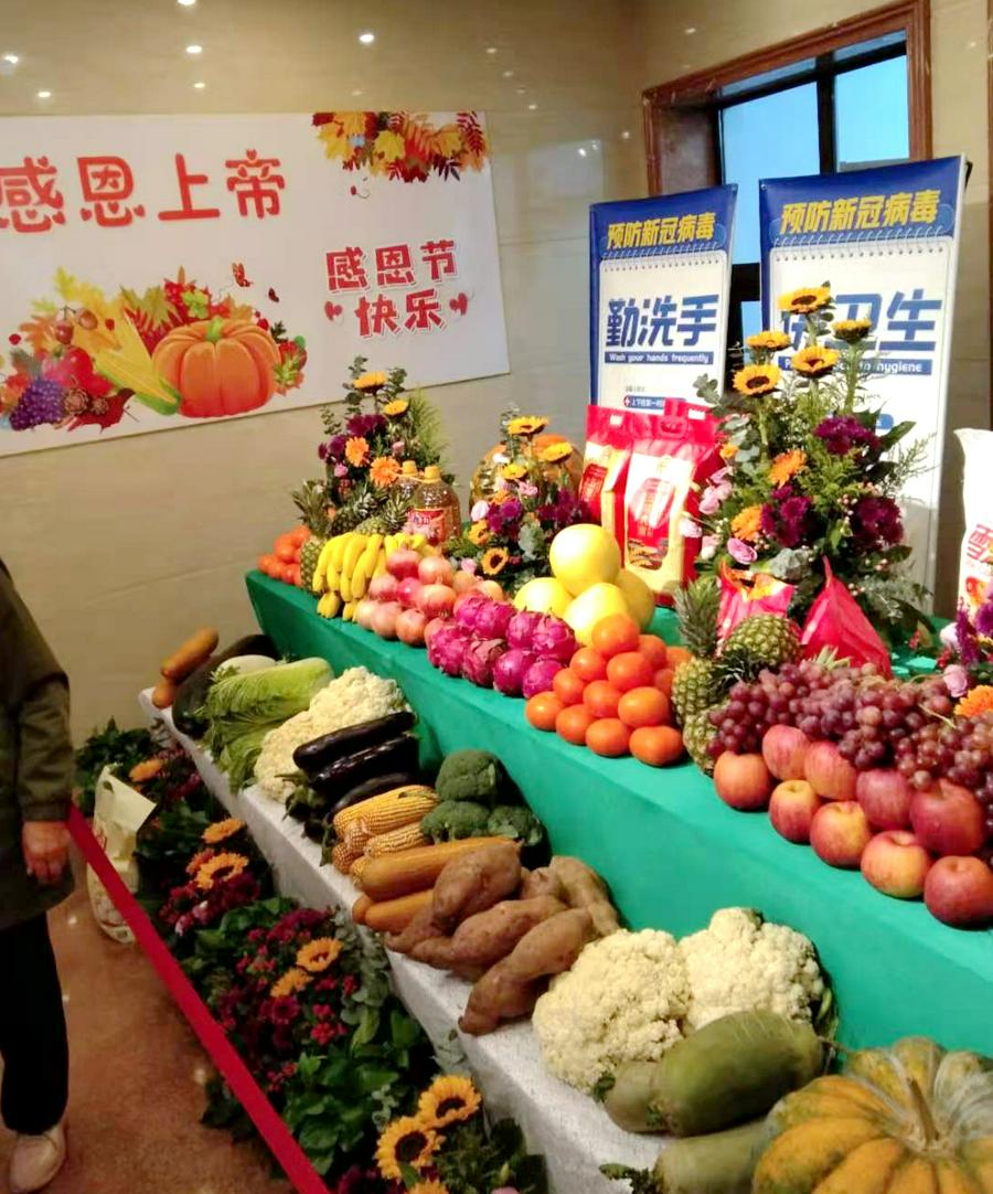 主日的泉水堂,充满着节日的喜乐,教会的教牧同工和服侍同工站在教堂的正门,欢迎弟兄姊妹并致以节日的问候。教堂从一楼到二楼坐满了前来参加感恩节的会众。教堂主堂的门厅醒目地摆放着象征丰收的各种果蔬、粮油,不少弟兄姊妹在此拍照留存记念。为了更好地赞美感恩,教堂各班组、团契为这一天早早就开始了节目的编排、彩排,有的提前两个多月就精心预备、精心组织。