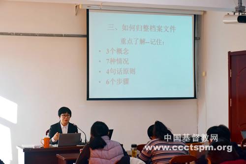 烟台市基督教两会副主任、副会长兼秘书长孙小禾同工结合多年教会档案管理经验,以“浅谈教会的档案工作”为题,采用理论、实操与案例相结合的模式,深入浅出地讲解了教会档案管理工作的重要性与必要性;阐述了各种情况下的档案整理要点;针对教会档案管理的特殊性,以及建立过程中遇到的问题与应对方法,与大家作了进一步交流。