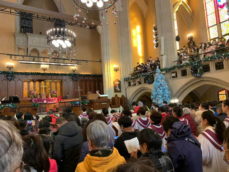 上海沐恩堂全天四堂礼拜都定为庆祝圣诞感恩礼拜,每场礼拜需要提前预约扫码,以严格控制人数,满足疫情防控要求。