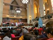 整个大堂和前厅被蓝色的圣诞树和彩灯装饰得焕然一新。众人陆续落座,14:00礼拜正式开始,在《齐来崇拜歌》的乐声中,诗班人员、主礼、证道牧者依次入场。主礼人宣布礼拜开始,大家一起读经路加福音2:8-14,这也是这次礼拜的主题经文。