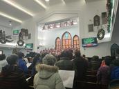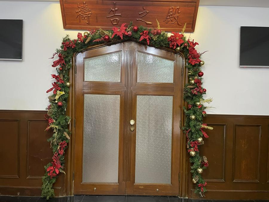 伴随着序乐的响起,在同工的帮助下找到了座位。堂内信徒都按着座位号间隔做好,讲台前方摆满了鲜花,正上方挂着“庆祝救主降生”六个大字,堂的周围装饰着圣诞树的花环,钢琴左前方也摆着一棵圣诞树。序乐在耳边响起,“平安夜,圣善夜,万暗中,光华射……”瞬间内心里涌出一股久违的平安,此时只想安静地沉浸在这崇拜中。