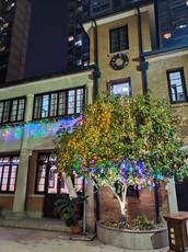 教堂大门并未过多装饰,只是在铁栅栏上布置了几个圣诞花环,透过门栏望向院内,到处都是彩色的小灯与饰品,院子里的几棵树上挂满了闪亮的灯带。随处可见欢迎圣诞的字样,仿佛进入了童话世界。