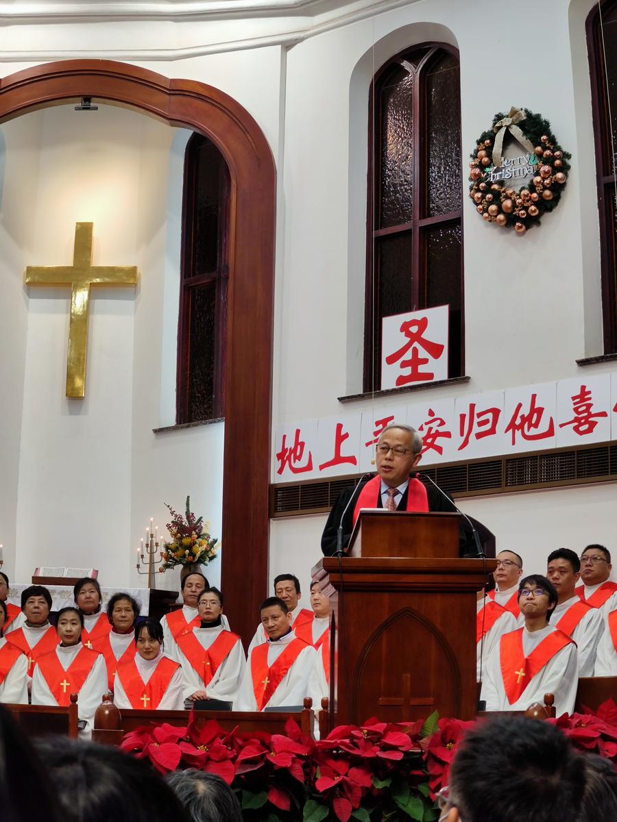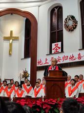 诗班一共献唱了六首诗歌,分别为《啊!圣善夜》《美妙声音歌》《我心灵得安宁》《欢庆圣诞》《为何我要歌颂耶稣》《奇妙平安由神来》。唱诗班赞美完毕,由于学忠牧师证道,主题为《平安归于祂所喜悦的人》,引用经文路加福音二章八到十节。于牧师分享只有从神那里可以领受真正的平安,而神会将平安赐给祂所喜悦的人。那些愿意悔改、愿意回转归向神的人,那么神所赐的平安就会临到他们身上。