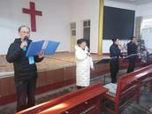 教会门前南侧,一面五星红旗迎风飘扬;正中院子大门两侧一幅红色对联更是引人注目。上联:“盼基督望基督基督来临”;下联:“庆耶稣贺耶稣耶稣降生”;横批:“普天同庆”。看着这幅吸人眼球的大红对联,真有点农村过传统春节的味道。圣诞节这天在门上贴对联,既有新意也有创意。这也许是福临堡教会在走基督教中国化的路上,在用中国传统文化偿试着宣释基督教的内涵吧!