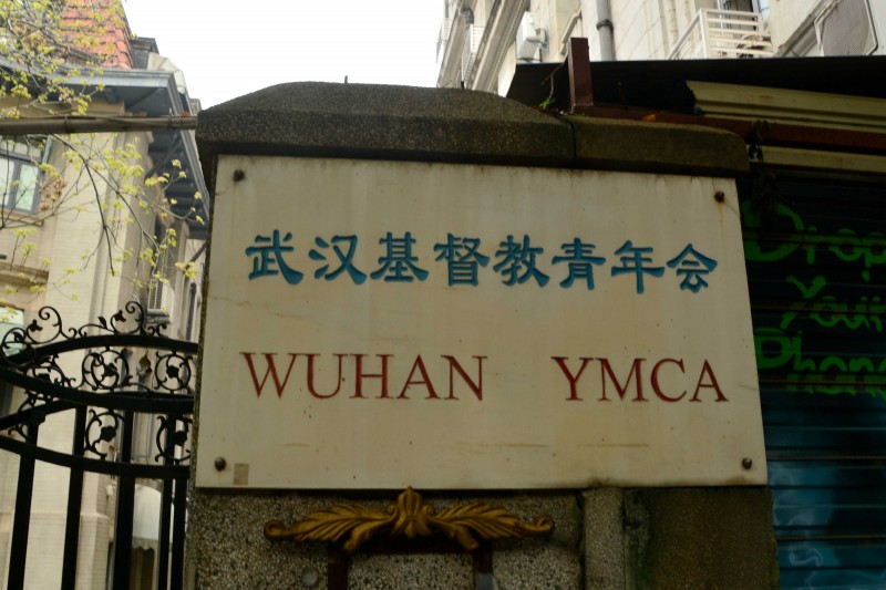 笔者和同工来到这里,看到一幢在这条路上格外壮观的四层砖木结构楼房,楼房在正中央显赫位置是英文Above the former site of the American Navy YMCA in Han Kou(大意是在汉口的美国海军基督教青年会)。