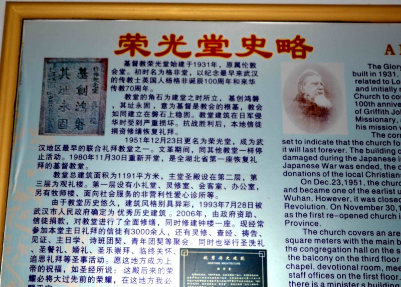 这是仍在作为基督教活动场所的比较老的教堂。该堂建于1931年,算来也是90年了。教堂在初期的名称为纪念英国传教士杨格非诞辰100周年和来汉传道70周年,故命为“格非堂”,后改名为荣光堂。