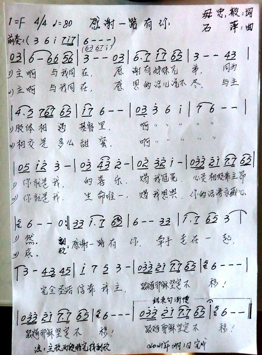 2020年年末,石萍姊妹在圣灵感动下,为主内一位弟兄的歌词《感谢一路有你》谱曲。她带着对主耶稣基督的爱和感恩之心,带着对教会牧长和弟兄姊妹同工的感谢之情,带着一颗敬畏和执着之心,一遍又一遍的修改自己的曲子,多达十几遍。有的时候灵感来了,即使是半夜也要爬起来修改曲子。
