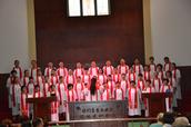 首先是教会诗班登台献唱,他们在钢琴音乐伴奏下,献唱了《向万邦传福音》《荣归天父歌》两首赞美诗歌。
