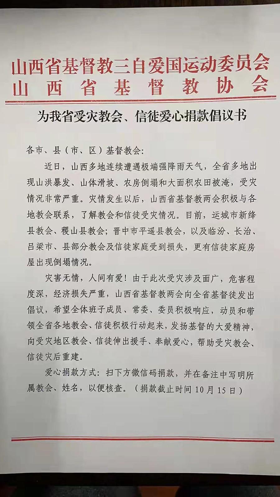 为帮助受灾教会、信徒灾后重建,近日,山西省基督教两会面向省内教会及基督徒发布爱心捐款倡议书,号召大家积极行动,支援灾后重建。