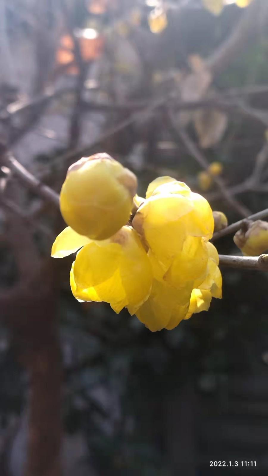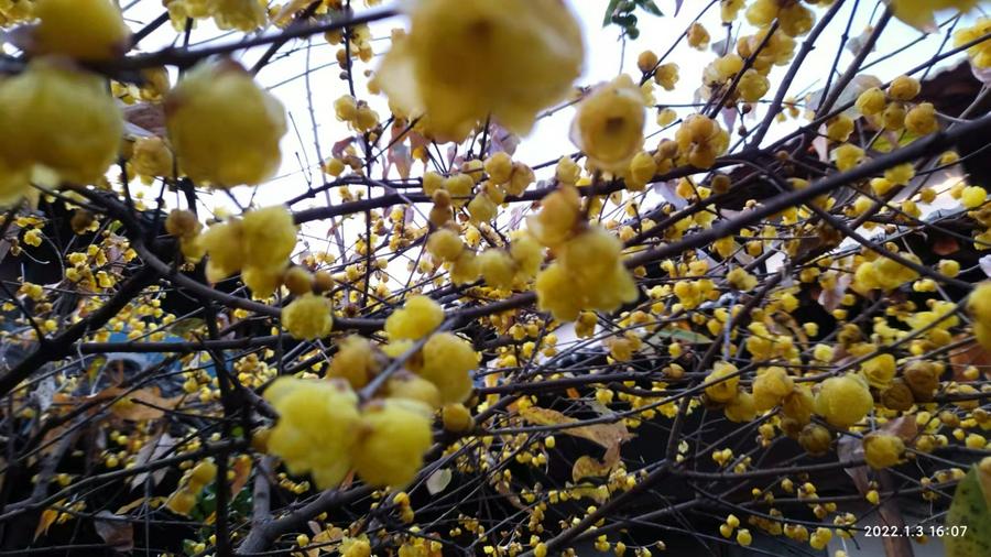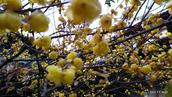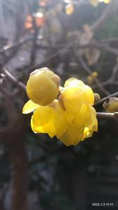 也许今年主人在家的缘故,今年的梅花开得特早,还未进入腊月就已经有花朵零星开放了。冬至一过,气温骤降,久酿待放的花蕾,静静地竞相绽放了,金黄色的花朵,团团紧凑,挂满了树枝,满院梅香萦绕,沁人心脾。