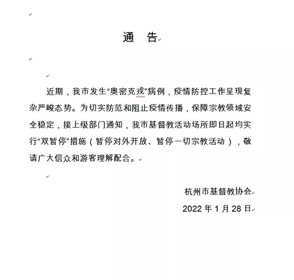 1月28日,浙江省杭州市基督教两会公众号发布通知,由于当地发生“奥密克戎”病例,疫情防控工作呈现复杂严峻态势,应上级部门要求,杭州市全市基督教活动场所将自通告发布之日起实行双暂停措施,暂停对外开放及一切宗教活动。