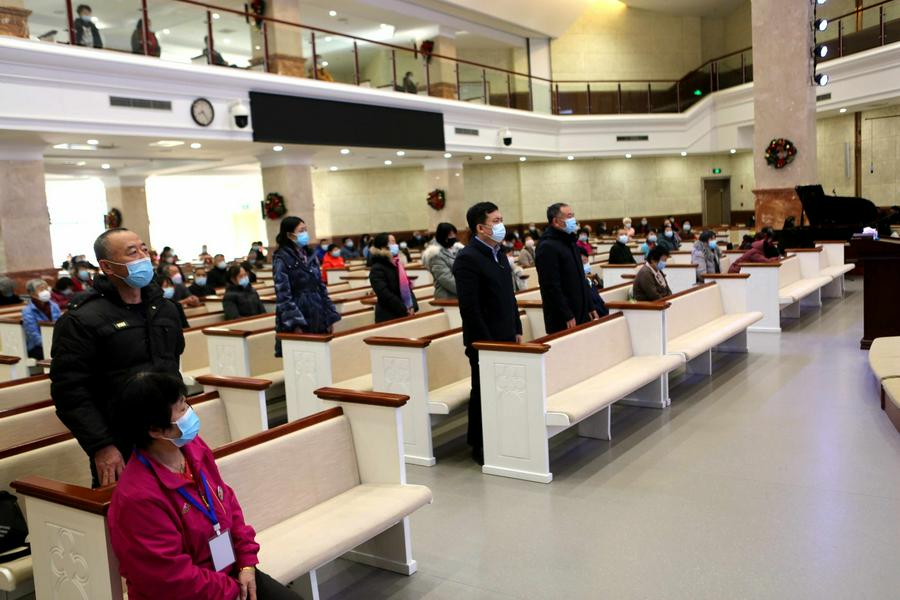 今天的聚会分为上午两场、傍晚一场。虽是礼拜日,但是为了春节七天假期很多上班族因为串休,不能来聚会。现场却是依然座无虚席。弟兄姊妹们在烘托着节日气氛的主堂里按照防疫要求间隔佩戴口罩坐好,跟随诗班赞美神。两位牧师分别主持三场聚会并为主证道。
