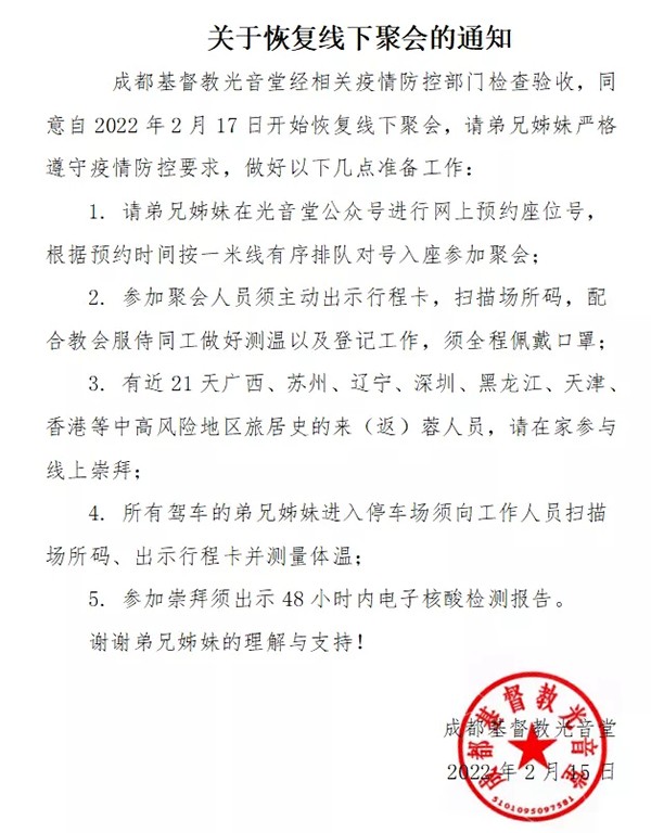 光音堂恢复聚会通知原文2月15日,四川成都光音堂通过微信公众号发布通知,经相关部门检查验收,该堂将于2月17日起恢复线下聚会。