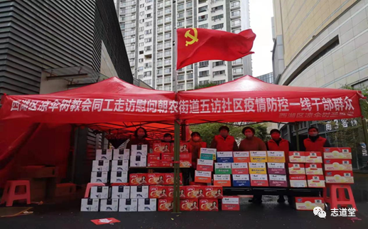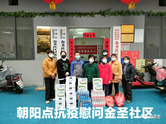 3月22日上午,西湖区凉伞树圣恩堂负责人徐金妹长老带领弟兄姐妹来到朝农街道五访社区,为防疫一线的工作人员送去价值3600元的方便面、八宝粥、纯牛奶等慰问品。