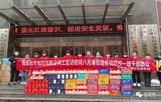 3月23日,东湖区青山教堂负责人邹玉华长老动员教堂弟兄姐妹奉献4000元支持社区抗疫工作;东湖区光明聚会点负责人李润群带领弟兄姐妹购1200元的物资赴社区防控点助力抗疫。3月24日进贤县基督教两会主任会长、中心教堂负责人胡会琴长老带领教堂兄弟姐妹赴抗疫一线慰问送上价值6000元的方便面、矿泉水等食品物资。