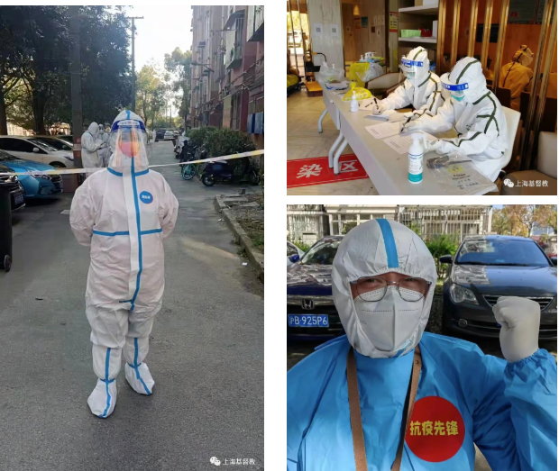 宝山区基督教两会及本区信徒更是以“主人翁”姿态参与到疫情防控的各项工作中。教牧同工及信徒积极参与志愿者队伍,有的帮助小区的居民登记核酸检测相关事项、有的帮助维持小区秩序、有的帮助小区物资配送、有的对场地和楼道进行消毒清理、有的辅助核酸筛查等,宝山区基督徒志愿者出现在不同的志愿者的岗位上。