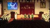 晚上7:00,崇拜开始,在《基督复生歌》中,诗班成员和牧者同工手持百合进入会场,将象征着复活的百合放在圣台上。开始赞美、祷告、读经后,范勇彬牧师以“复活喜讯”为主题,围绕马太福音28章1—10节经文证道,带领会众一起思想耶稣复活的真理。