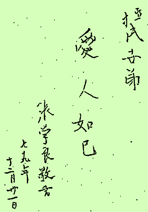 书法:张学良的国学功底甚为深厚,诗词歌赋皆有涉及,尤其以书法最为出名。我曾经有幸目睹他给我们“张学良暨东北军史研究会”的题词——“爱人如己”行书,在用笔上甚为讲究、独到,很规矩,法度严谨,一上眼就知道是一位练家子,而且还是诸家之象,有“二王”的潇洒风神,还有赵体行书的流美,笔断意连,行云流水,章法布局也是别具一格,疏密得当,线条以粗线条为主,形成强烈的视觉冲击力,让人赏心悦目。据新华社记者任珂记载:经常有人向张学良提出题字的请求,而他每次总是喜欢题“爱人如己”四个字,即便是到了晚年,眼睛已经看不清楚了,他照样能悬着手腕写下“爱人如己”这几个字。他笔下的篆书精美凝重,行草书是龙飞凤舞,不拘一格,行书潇洒飘逸,而楷书却中规中矩,遒劲端庄。