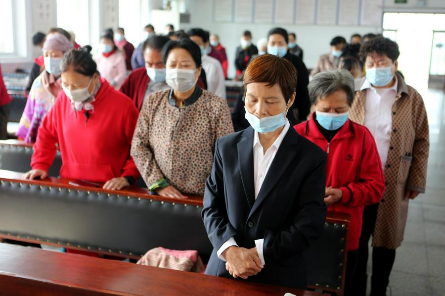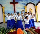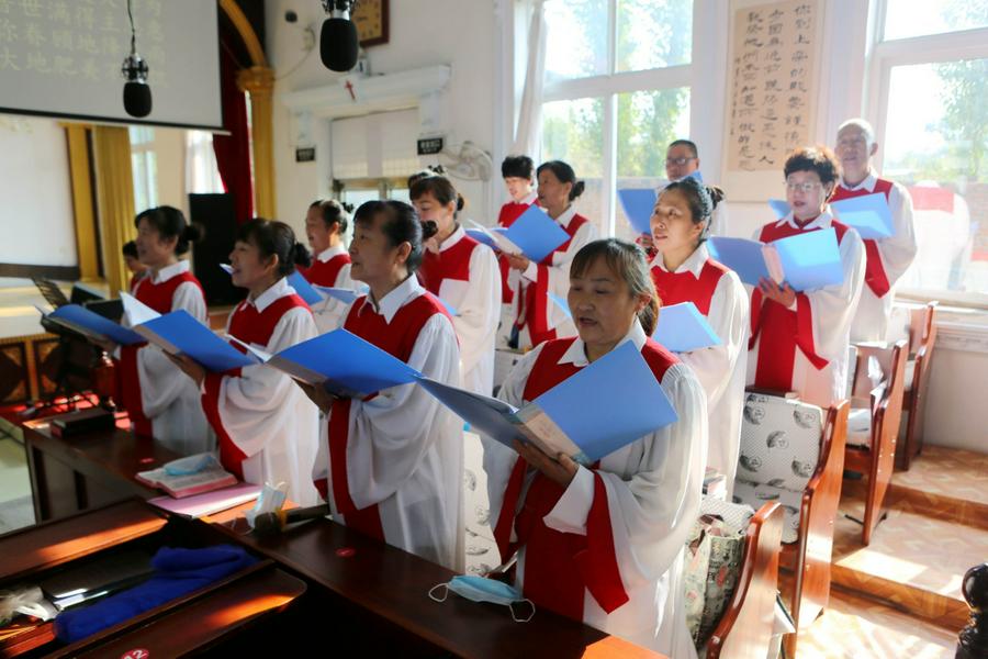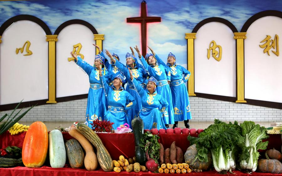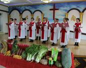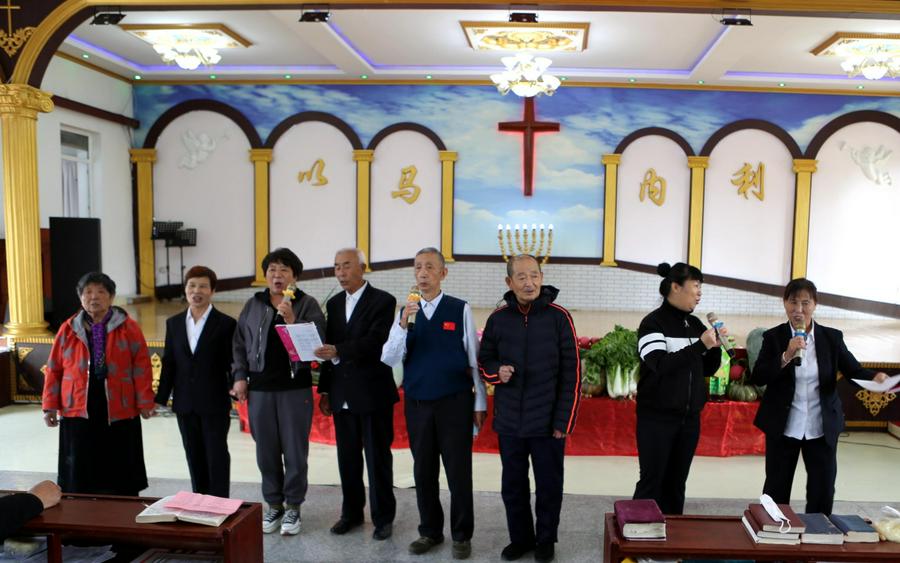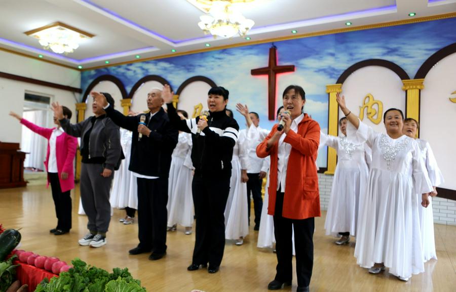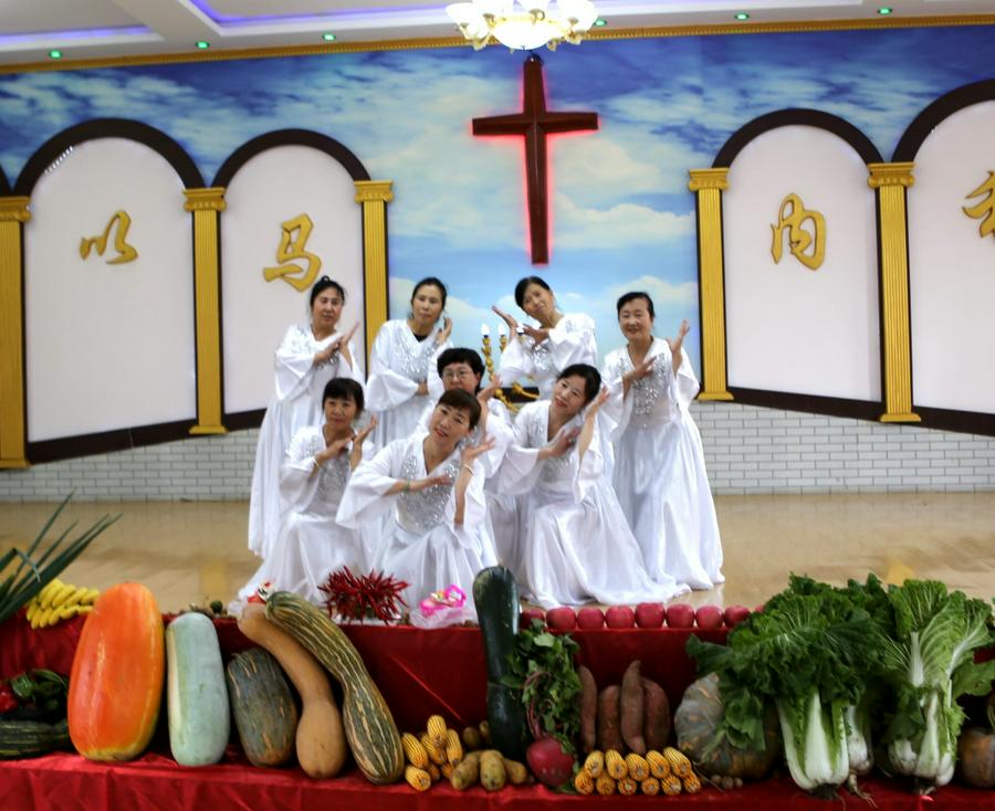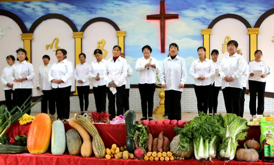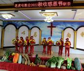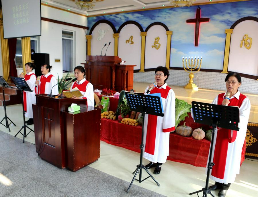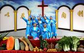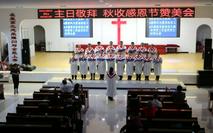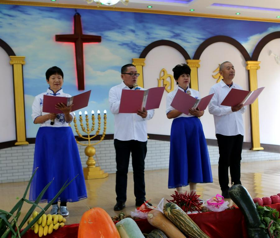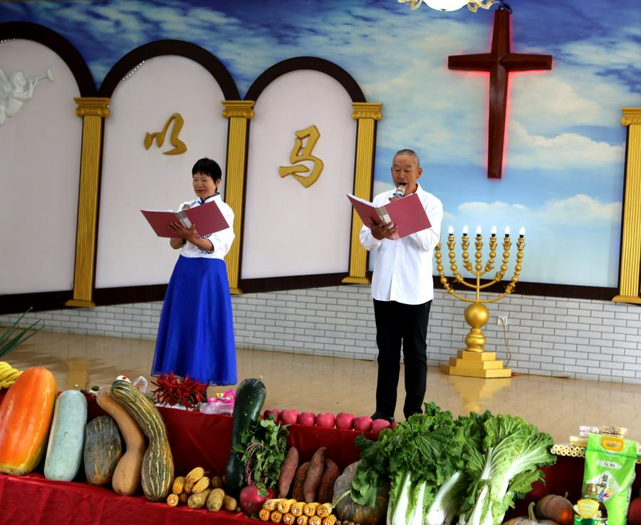 在主堂,父老乡亲们跟随领诗的五位姊妹高唱《秋成谢恩歌》、《收成归天家歌》等诗歌,“赞美我天父,向主献上赞美颂扬”。