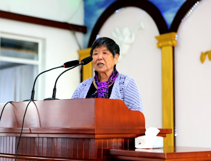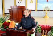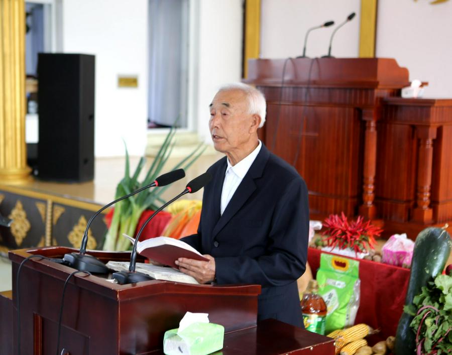 今年82岁、从1984年教堂恢复聚会即开始传道的鞍山市老传道人王福荣姊妹登上圣台,她带领会众读圣经使徒行传14章17篇的经文,“然而为自己未尝不显出证据来,就如常施恩惠,从天降雨,赏赐丰年,叫你们饮食饱足,满心喜乐”,然后以“秋收感恩的意义”为题,与弟兄姊妹分享“感恩节的来历”、“感恩的内容”、“人的归宿”等四个方面的体会。王福荣老姊妹在鞍山地区主内享有声誉,她以既有神学观点,又有接地气的讲章,告诉父老乡亲,我们信徒有“三样宝”:读经、赞美、祈祷;她祝愿大家一生蒙恩、十分平安、百事顺利、千倍收成、万事如意。最后以圣经经文与大家共勉。