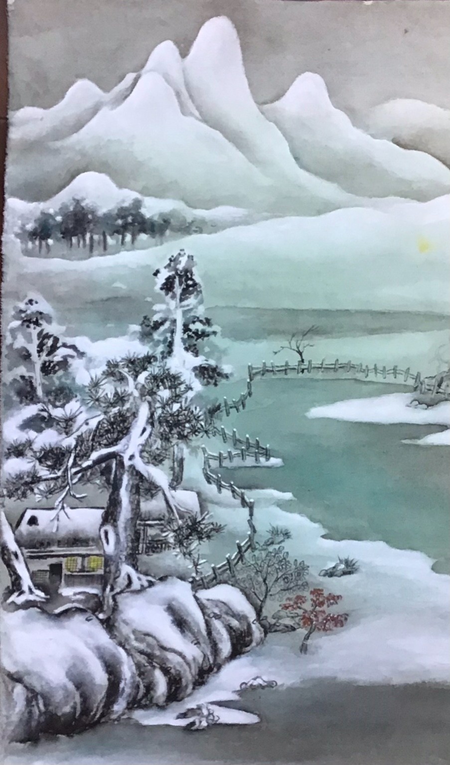 我在霜雪地里踱步,今天就下笔画雪景。虽然是描绘雪景,我很明白不能给人萧瑟荒凉感,相反,在我构图冰天雪地的景色时,似乎还隐约能够感受到一丝融融的暖意。尤其是雪景中的人家,他们家窗户透出暖暖的光,为了突出冬日景象,特别让江面与天空都以淡墨晕染。而为了强调山头积雪,天空的墨色有意加重,这也使整个画面更加统一,就像生活对神有盼头,相信祂不是浪得虚名。