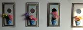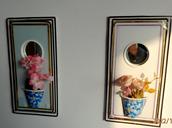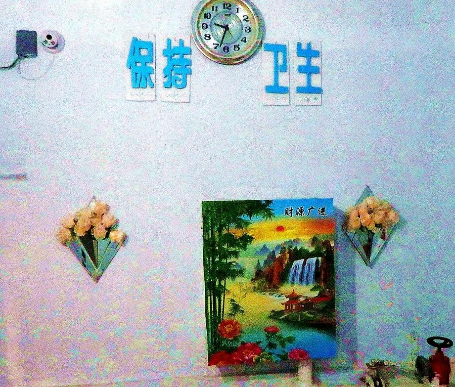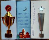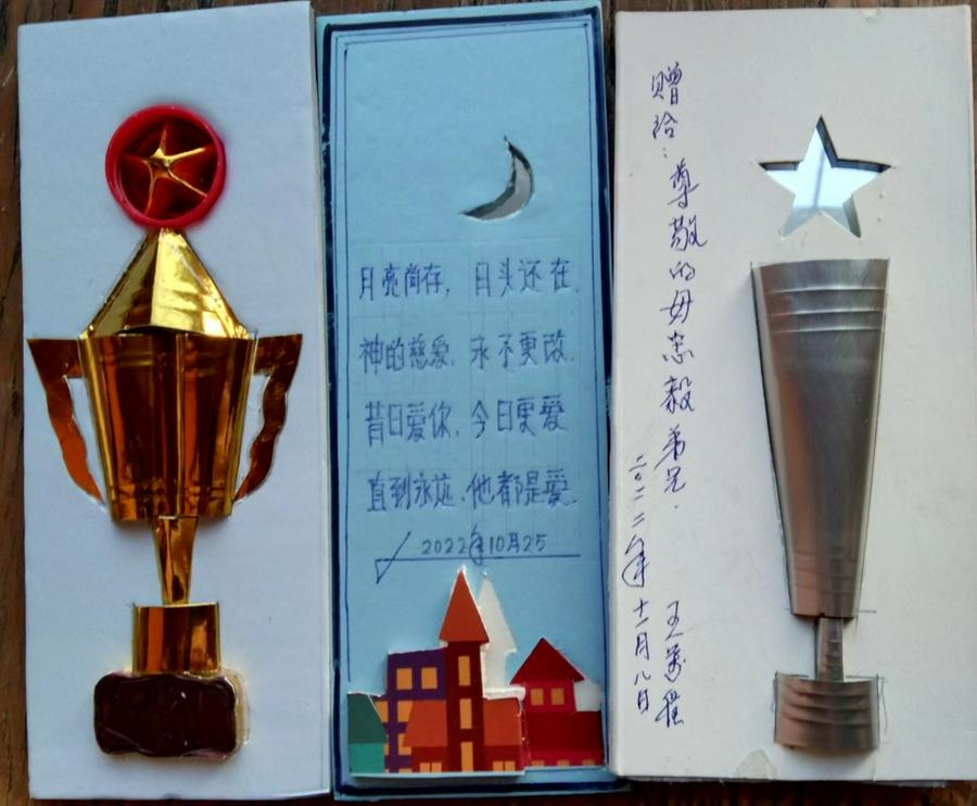 到王万程弟兄家里拍摄他获得的那些荣誉证书的时候,看到他的家里拾掇得窗明几净、整齐划一,所有物品摆放得井井有条,给人舒适的感觉,是一个充满温馨的和睦家庭。内心的洁净,也反映在外在。他的老伴儿每天不辞辛苦的打理家务,他有的时候还拖着有病身体擦拭家里的窗户。我叮嘱他你住31楼可要注意安全啊。他笑着说没事。在他的阳光明媚的卧室里有几幅非常漂亮的手工作品挂在墙壁上,我以为是他买的,他告诉我这是他用扑克牌、饮料瓶、泡沫等废物利用做的。他的老伴儿支持他做这些手工艺品,还专门为他买了切割玻璃的刀。看到他当场亲手为我用一张糖果纸做的一个类似舞蹈的、彩色“小人”,我感到很惊讶,原来老弟兄还这么心灵手巧。他赠送我专门为我做的、用饮料瓶、瓶盖做的手工艺品。在一个用薄塑料泡沫做的小工艺品上,他精心用刀刻制这样一幅场景:暗蓝色的天空中,在银色的一轮弯月下,绛紫色的尖顶教堂和建筑物教堂,在月牙和建筑物中间的空白处他用笔写下了“月亮尚存、日头还在,神的慈爱,永不更改。昔日爱你、今日更爱,直到永远,他都是爱”,很是令人感到上帝之爱、信徒相通。看着这些精美的工艺美术品,我看到了一个老信徒内心的美好、圣洁,对神创造的世界的热爱和生命里的活力及智慧和充分的想象力、创造力。