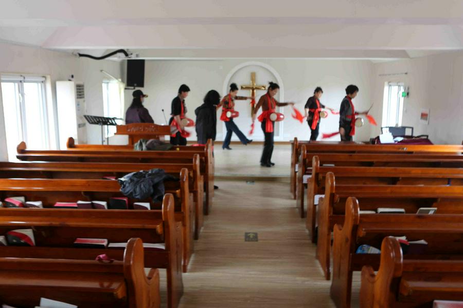人们现在看到的这里实际不是当年的教堂,而是学校的旧址,归还给孤山镇基督教活动点后作为教堂,现在是信徒们聚会、崇拜、赞美上帝的活动场所。我们在教堂主堂看到这里圣台上拱形装饰下是金色的十字架,堂内整齐的摆放着座椅,有的姊妹正在进行迎接复活节活动的文艺节目的彩排,一派充满上帝恩惠的祥和氛围。