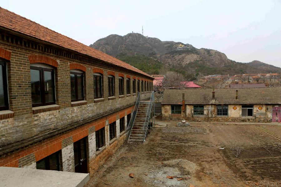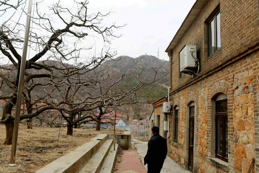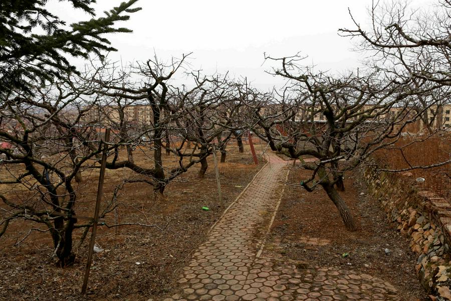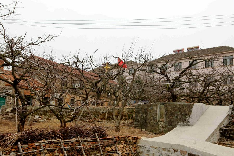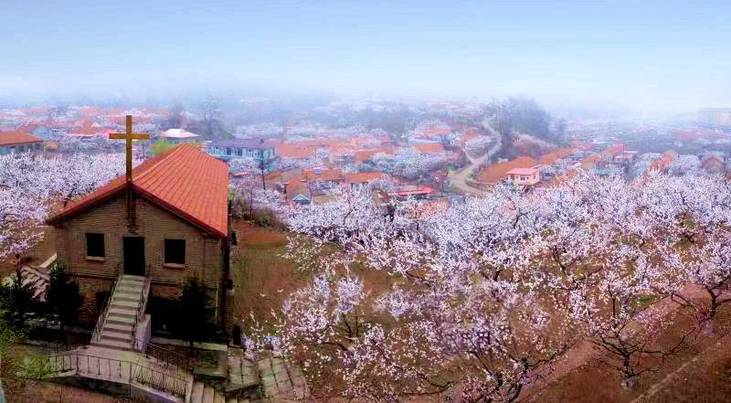 来到教堂所在地,我立马被眼前的景色所吸引:现在的教堂矗立在果树环抱当中,远处是巍峨的国家级森林公园大孤山,蓝蓝的天空、初春清新的空气、红瓦淡黄色、青色墙体的房屋,我不禁端起相机按下快门……