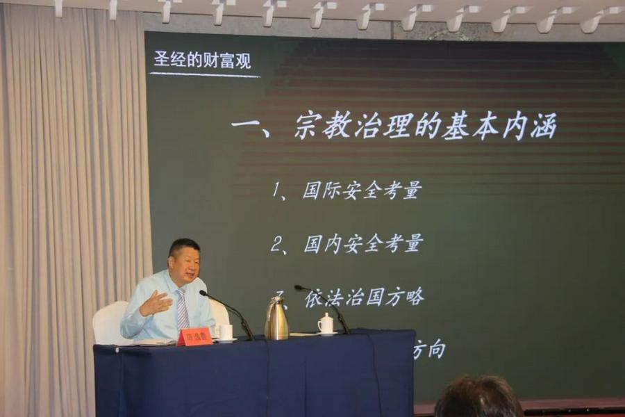 青岛市委统战部政策法规处二级调研员,青岛市社会主义学院客座教授刘永成以《践行我国宗教中国化方向》为题,从什么是宗教中国化、为何要中国化、历史上的中国化探索、如何践行中国化方向四个方面做了讲解和指导。